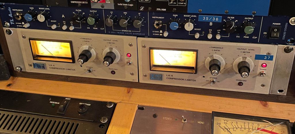 It was the first record that I was properly able to mix with my hybrid system at Chuck’s, with all the important stuff like kick, snare, bass, stereo drum and vocal buses going through hardware, and a UAD LA-2 legacy plug in on almost everything else. I’m still ironing out the kinks, but it’s a joy to see those LEDs flash and those needles twitch.